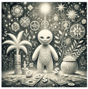 Experience the mystical allure of Surinamese heritage with the Bakru Winti Doll Moneymaker on Canvas. This vibrant piece is infused with the cultural charm of the Bakru Winti Doll—traditionally believed to attract prosperity—while its modern artistic style captures the eye in any space. Embrace a slice of rich tradition and invite an aura of abundance into your home with this captivating, conversation-starting work of art.